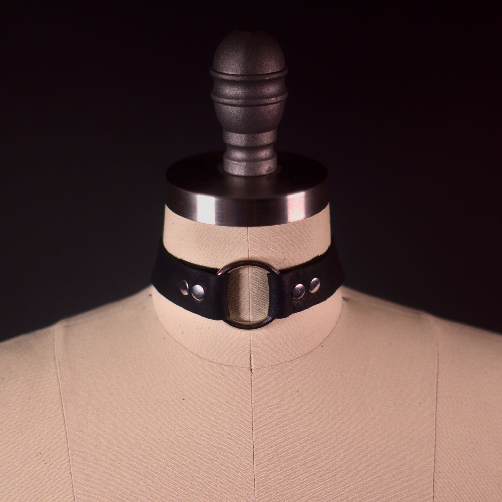 Simple 1" wide leather band with silver O-ring and silver or gunmetal rivets and buckle.