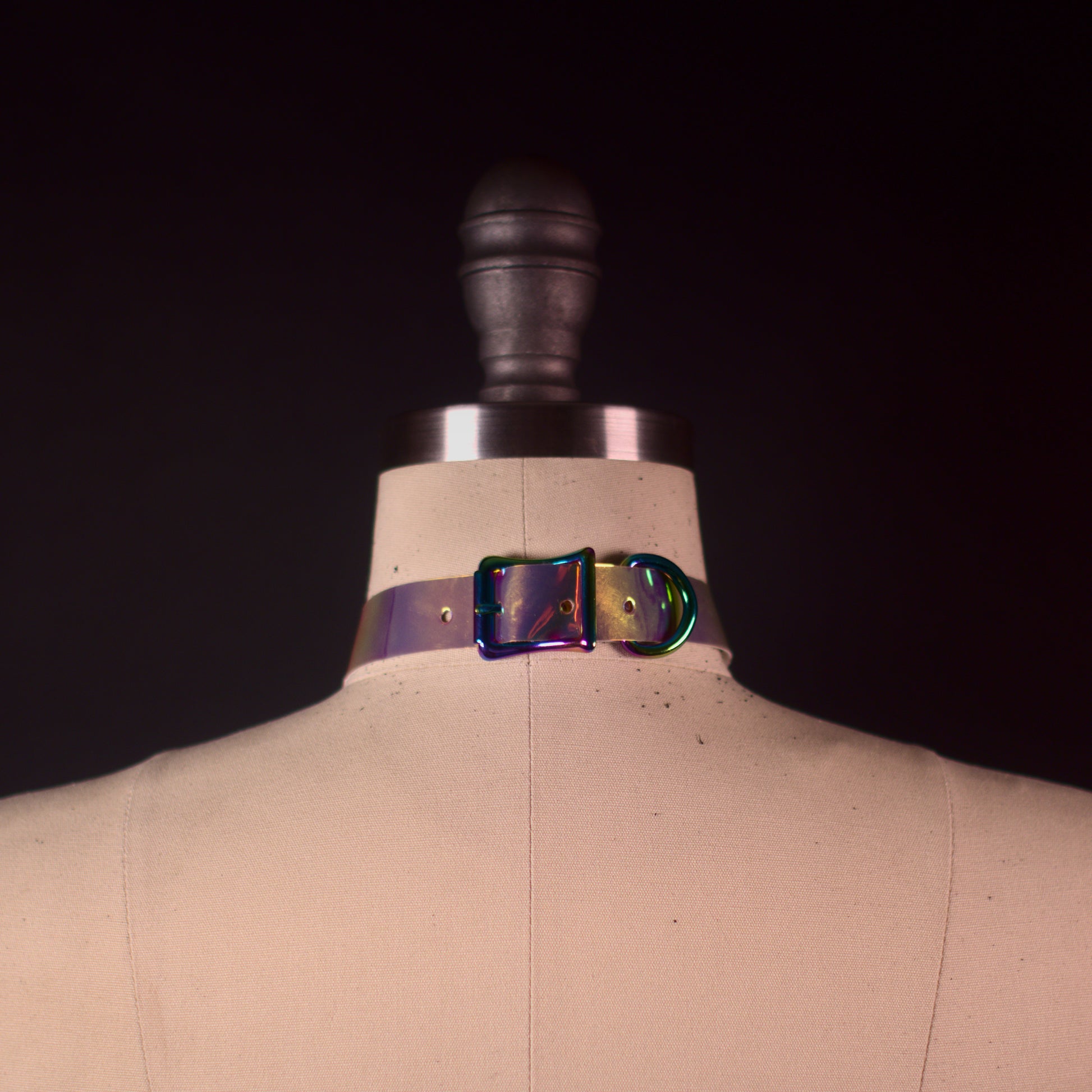 Simple 3/4" holographic vinyl band with all gay, all rainbow hardware.