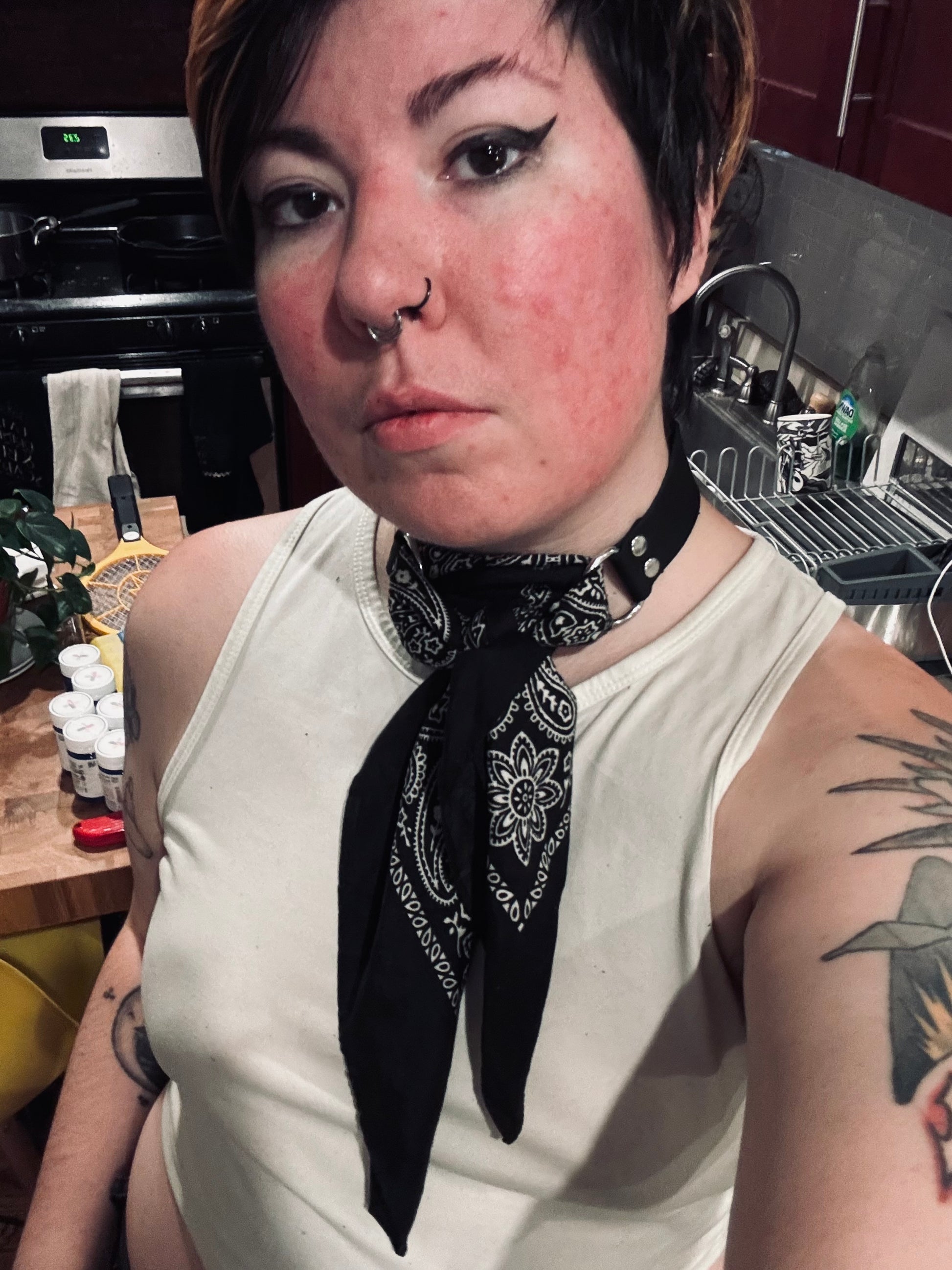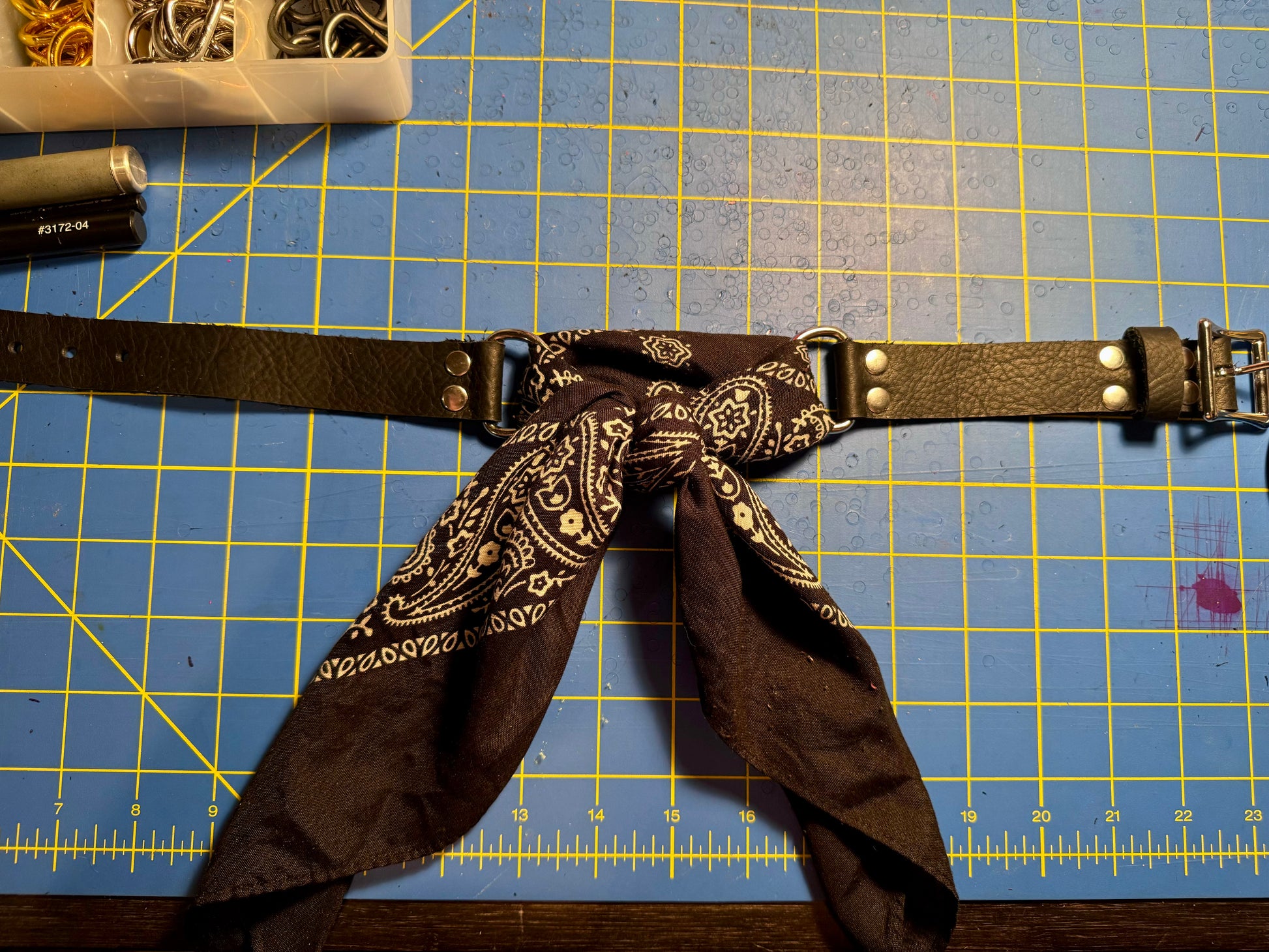 This collar features a 1” black leather band, your choice of silver or gunmetal hardware, and your choice of bandanna color.