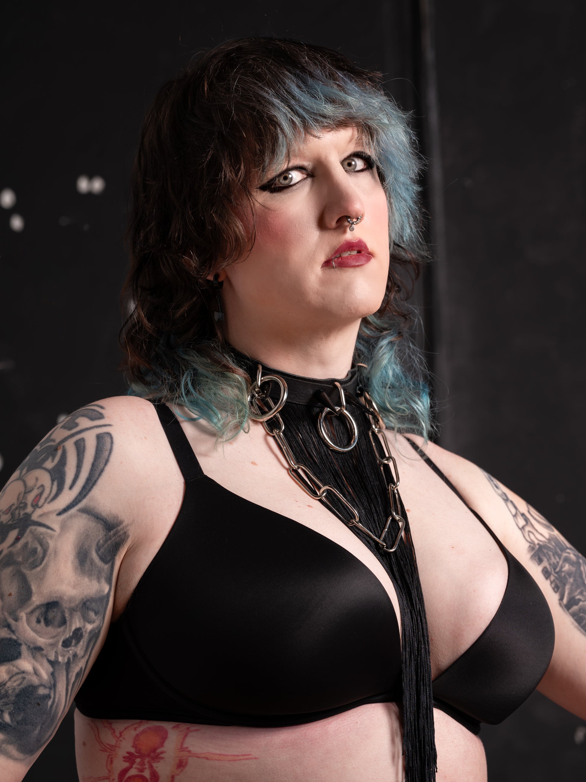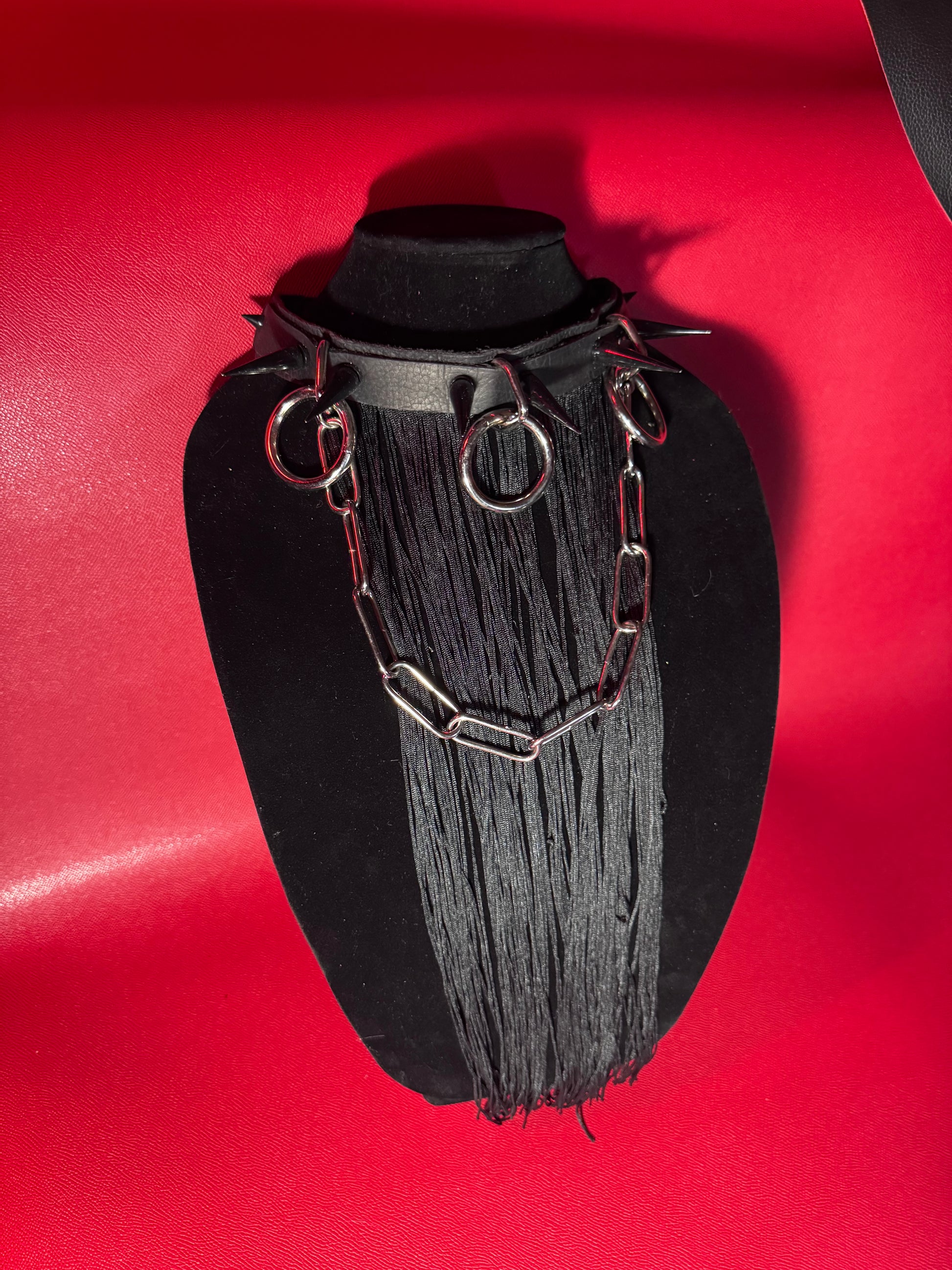 Introducing the gothic beauty, Hel! This collar features three bondage rings held on by 2” black cone spikes, and a length of long black fringe down the front.