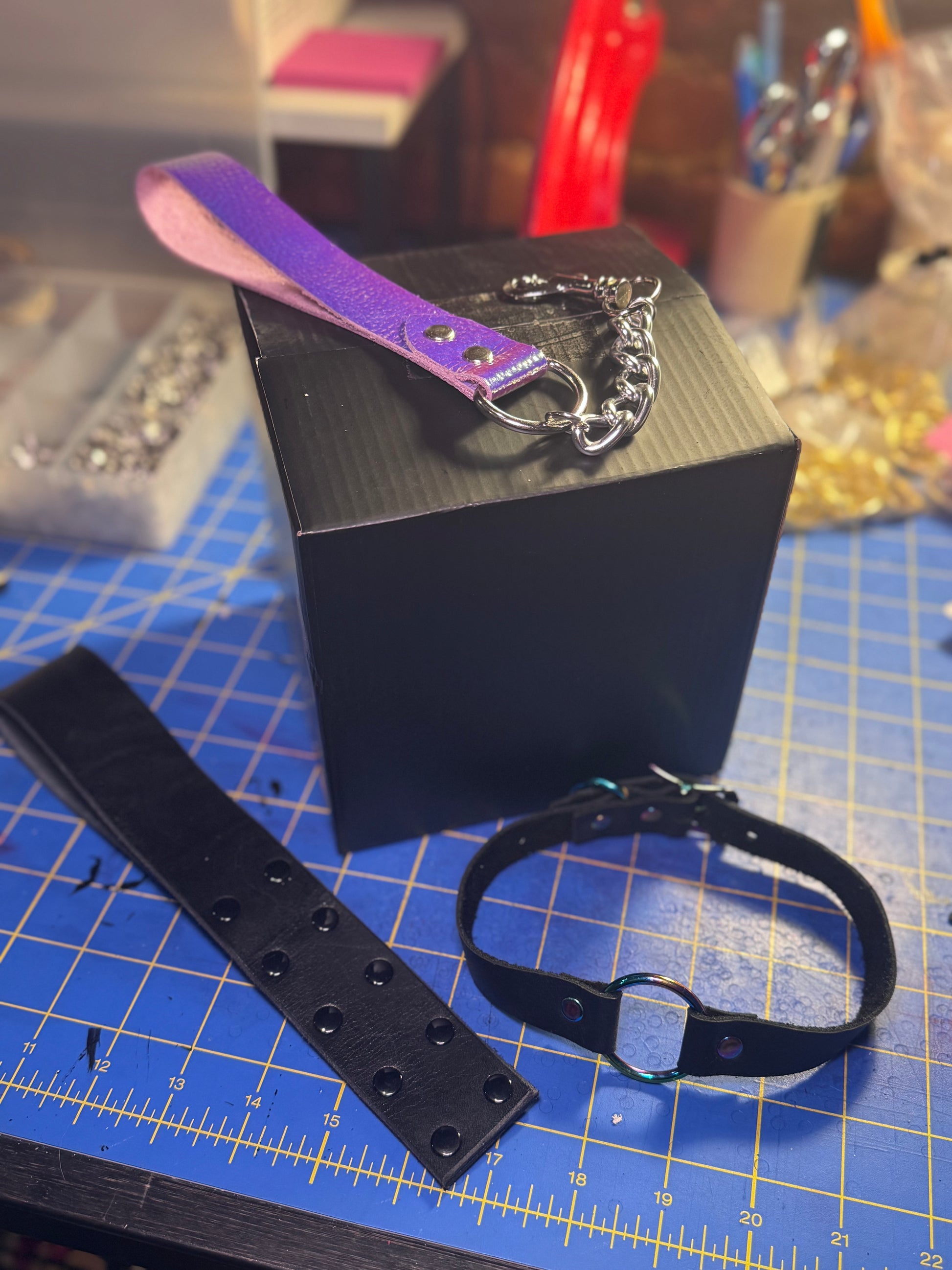 You get what you get! And what you get is a mystery selection of one collar, one small slapper, and one leash handle!