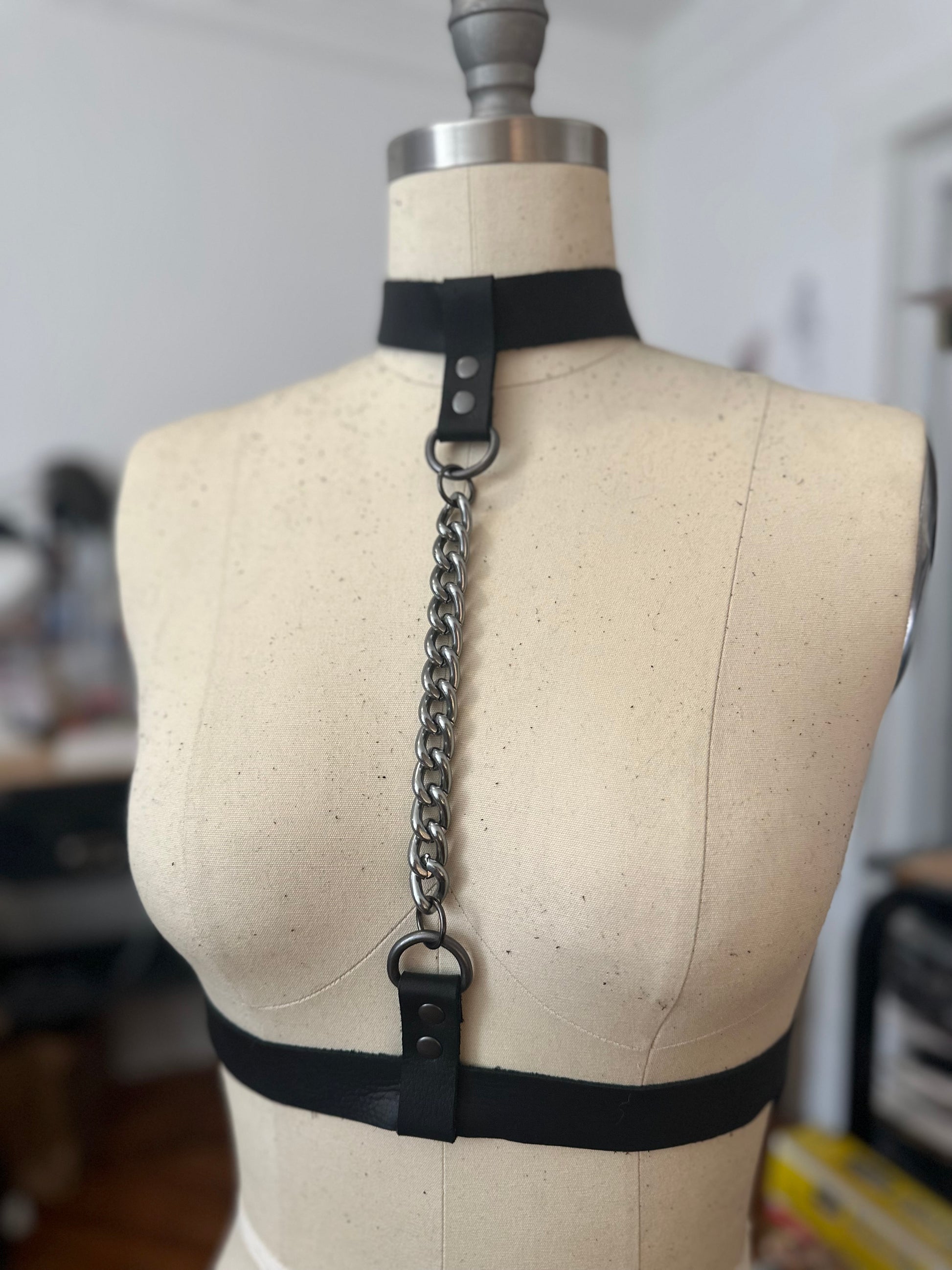 Simple chain harness with 1" black leather neck and underbust bands, available with silver or gunmetal chain and hardware.