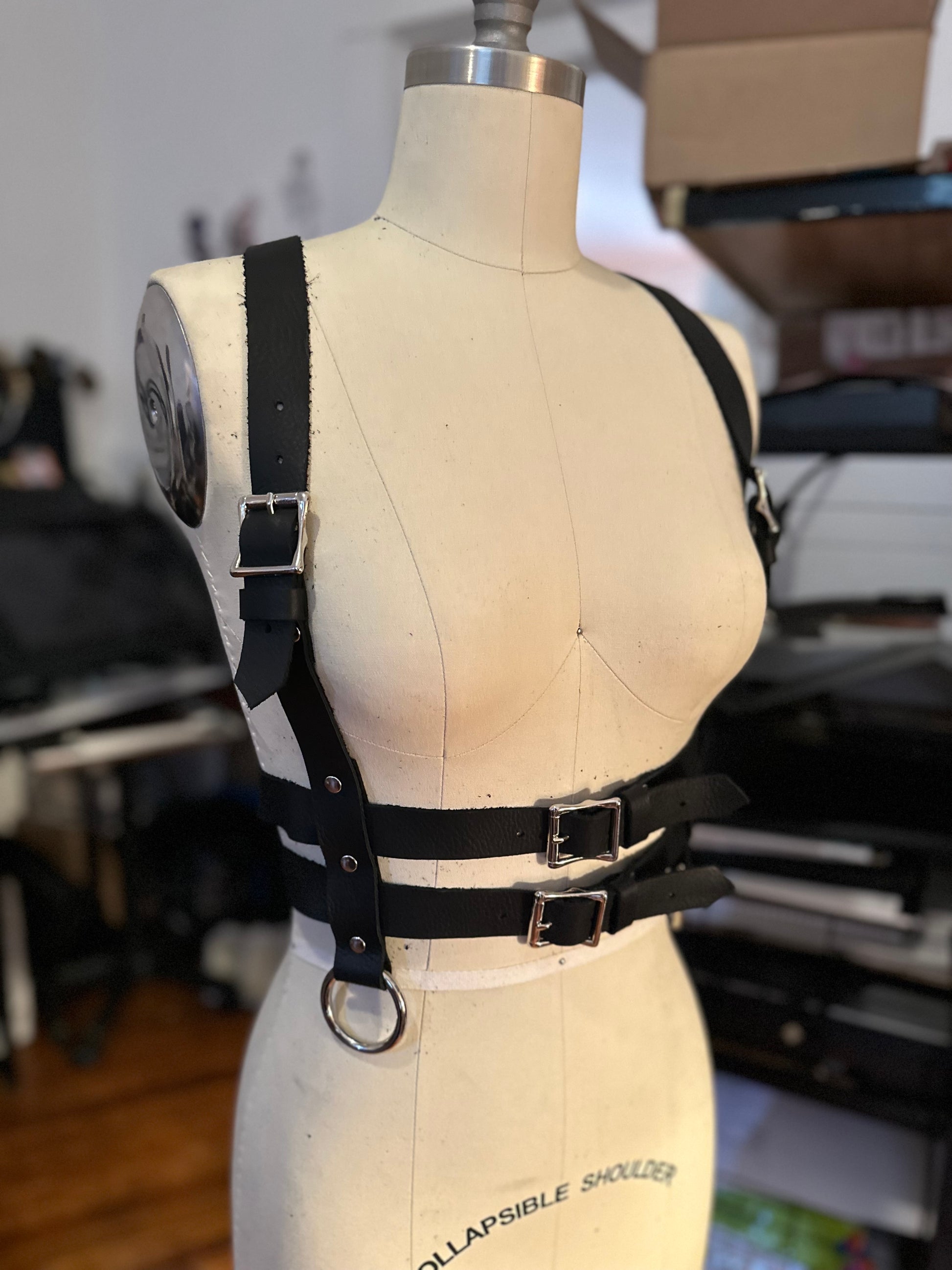Suspender style harness with double underbust belt and large O-ring attachments, made with 1" black, cream, or oxblood leather straps and available with silver hardware.